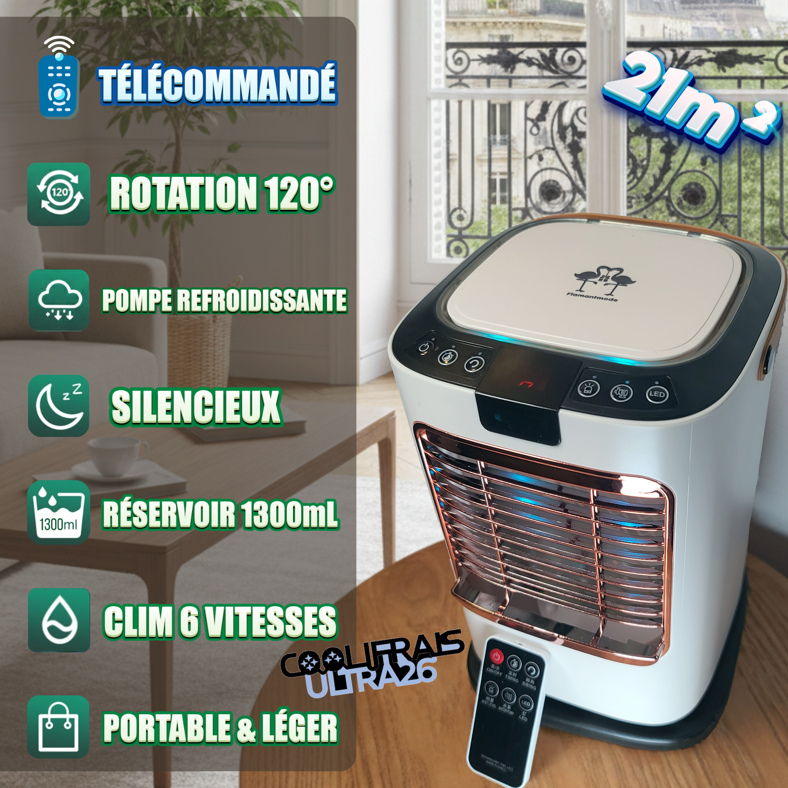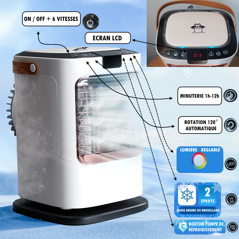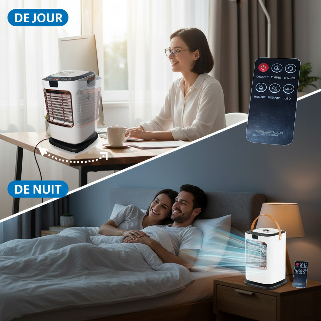 Mots-clés: climatiseur mobile, clim mobile d’appoint, rafraîchisseur d’air, mini climatiseur, climatiseur portable, refroidisseur à eau, brumisateur, USB Type-C, rotation 120°, 21 m², silencieux 35–39 dB, double réservoir 1,3 L.